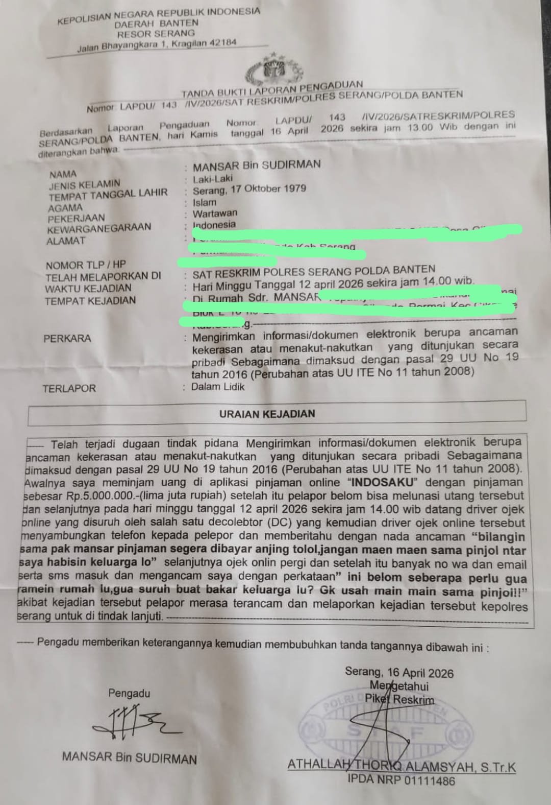 Kini kasus tersebut berujung pada laporan ke pihak kepolisian Polres Serang dengan nomer laporan LAPDU/143/IV/Satreskrim Polres Serang/Polda Banten tertanggal 16 April 2026.